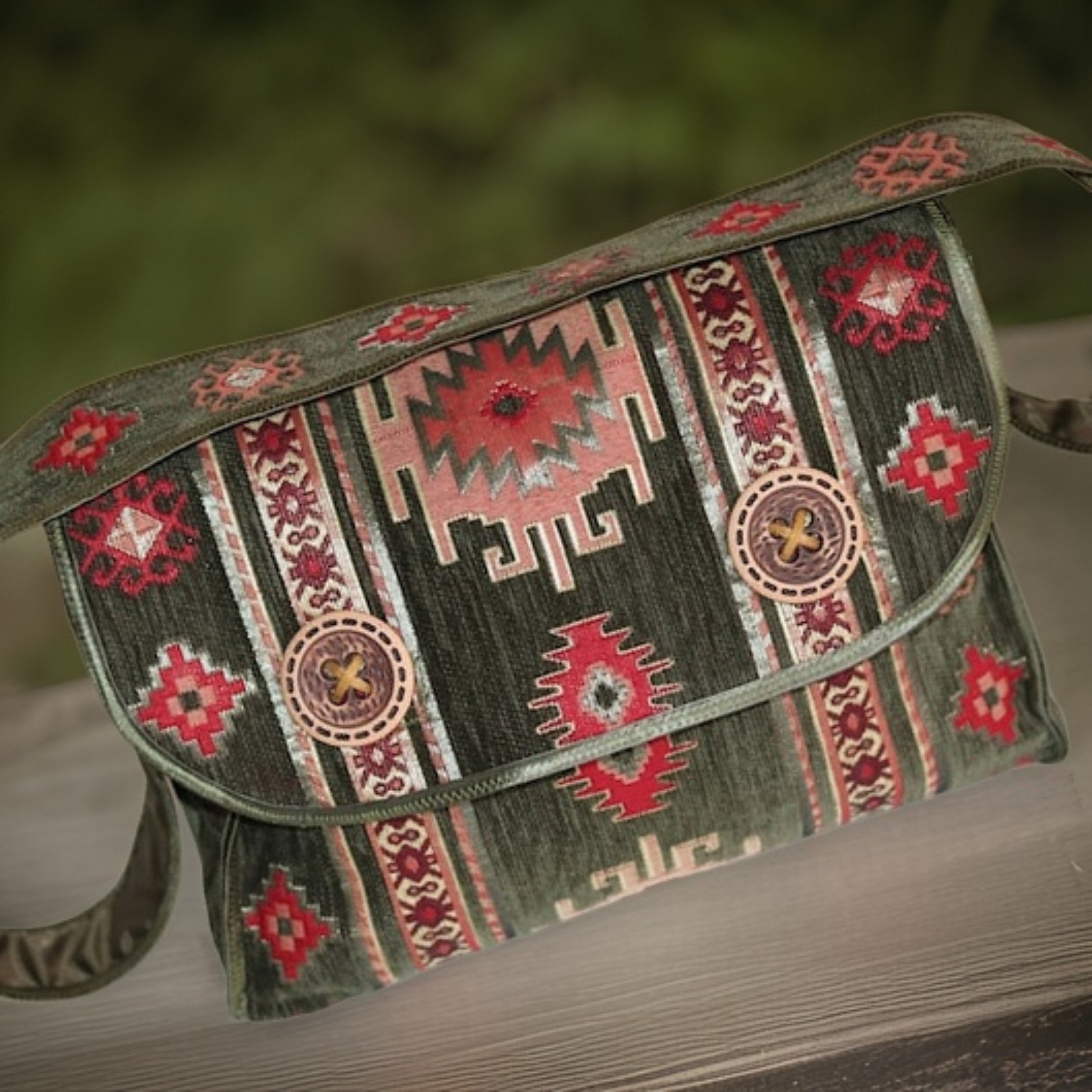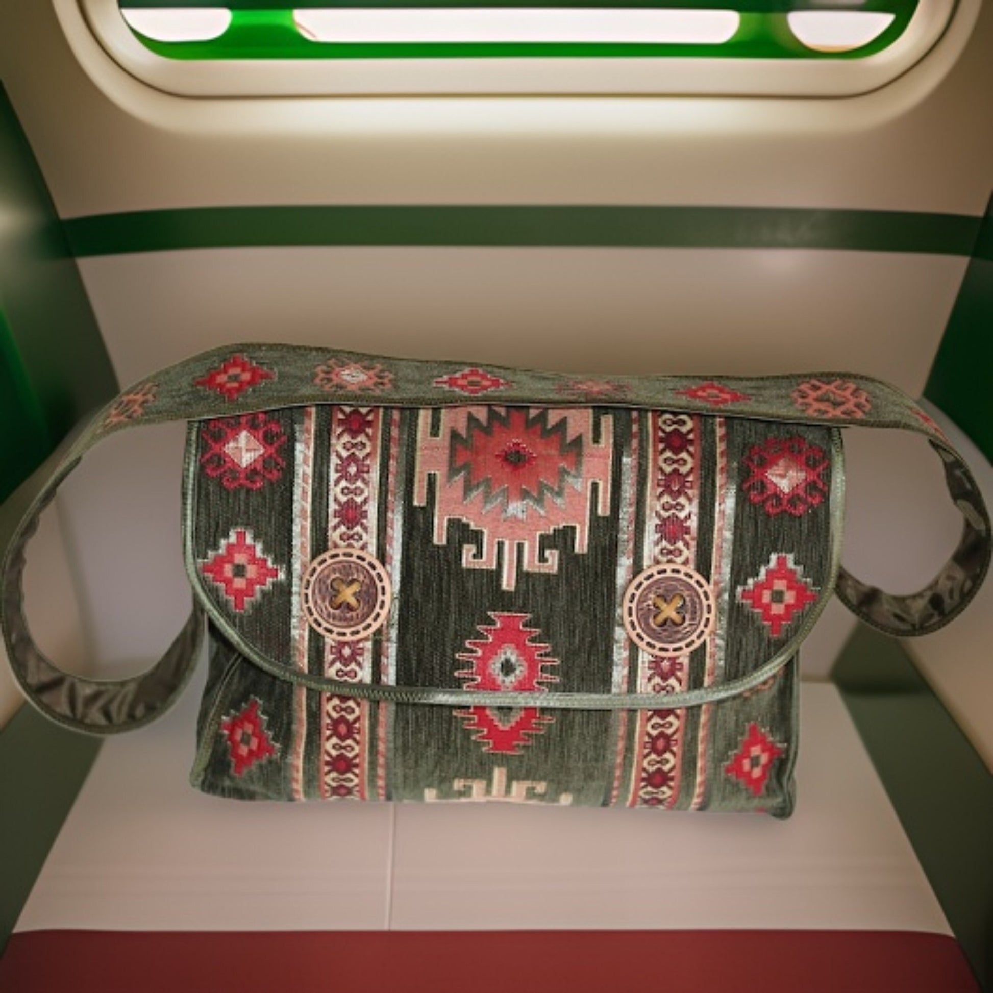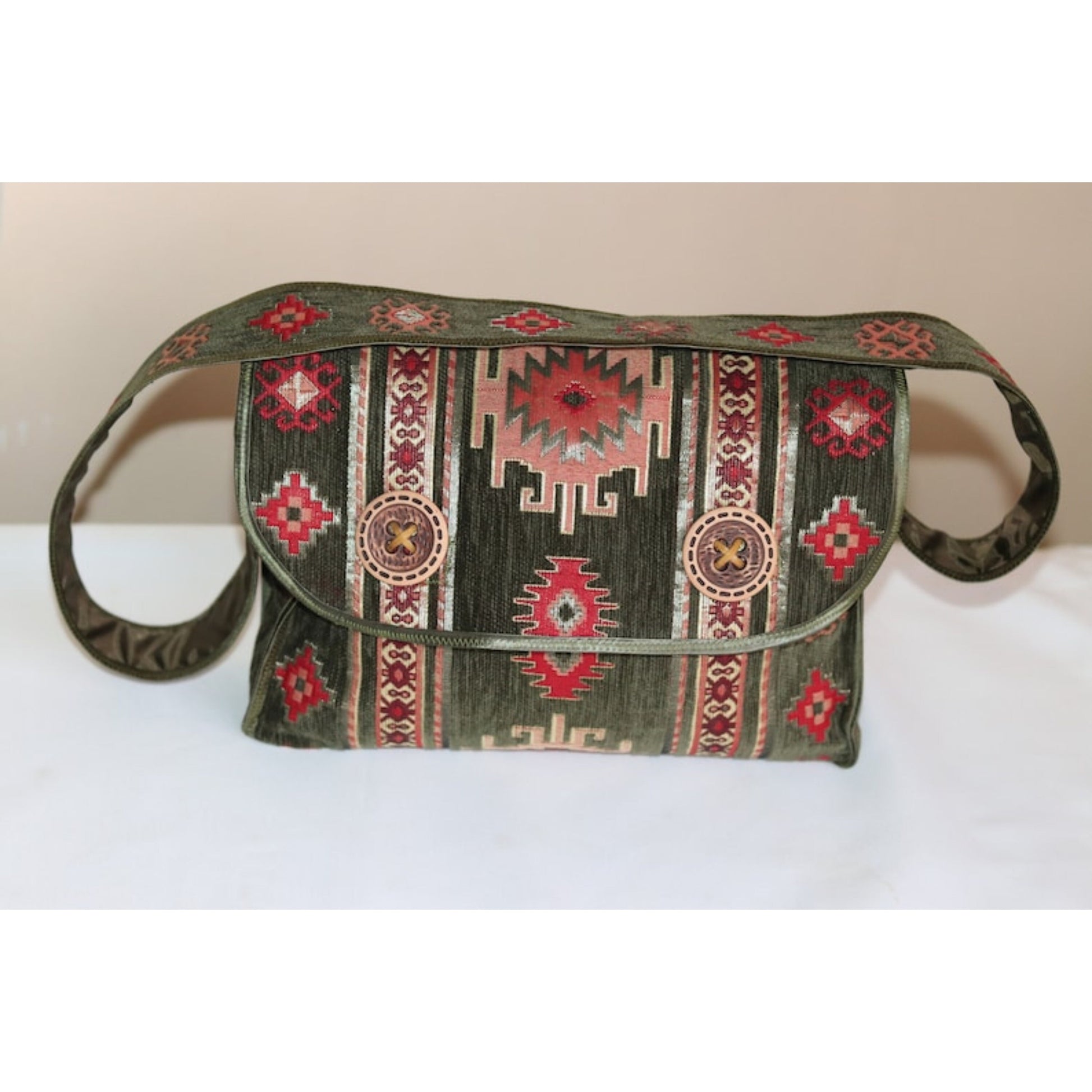 Olive Green Armenian Motifs Cross Body Bag, a true masterpiece that combines traditional Armenian design with modern functionality. Handcrafted with meticulous attention to detail, this unique carpet messenger bag is a fusion of art and fashion.