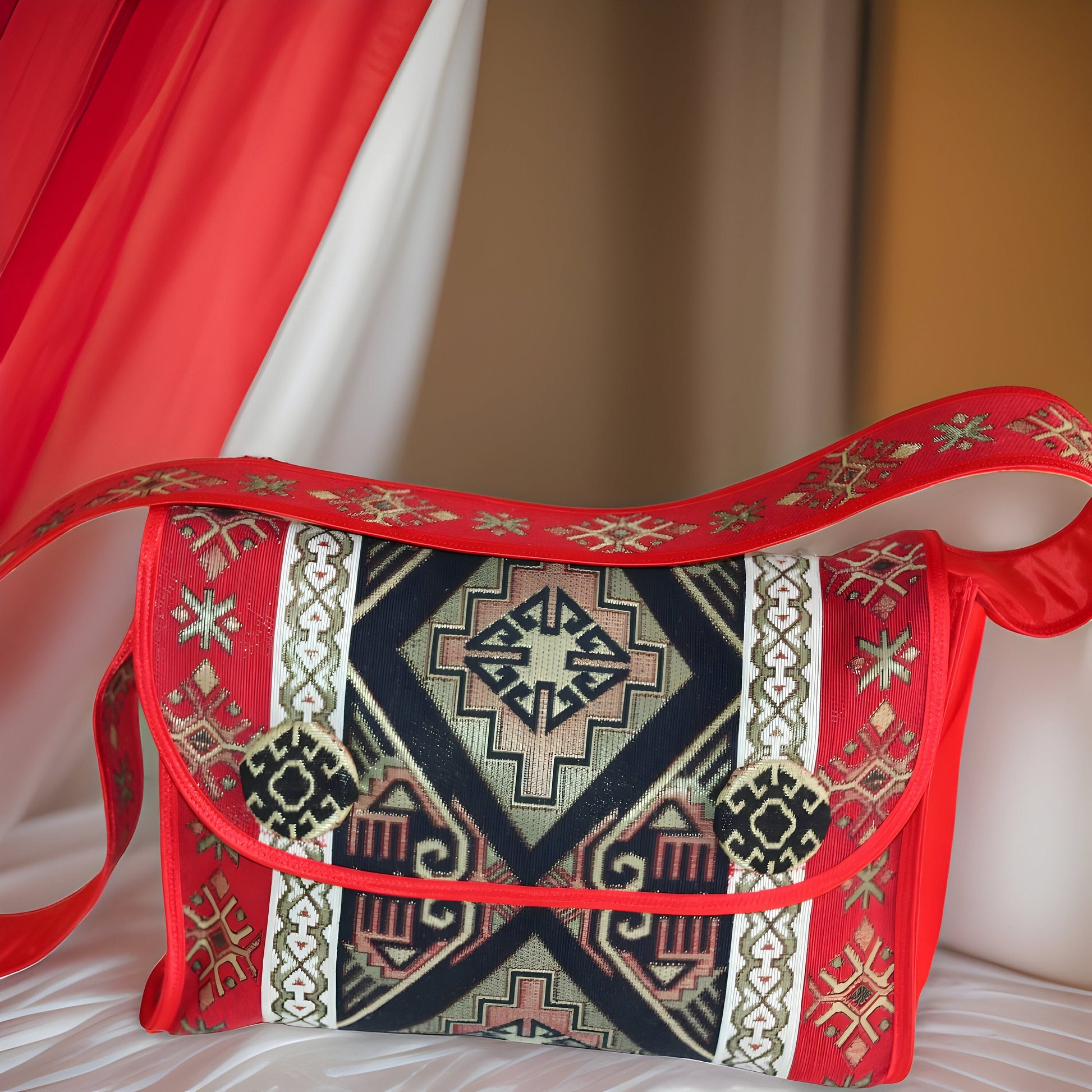 Red Armenian Motifs Cross Body Bag, a true masterpiece that combines traditional Armenian design with modern functionality. Handcrafted with meticulous attention to detail, this unique carpet messenger bag is a fusion of art and fashion.
